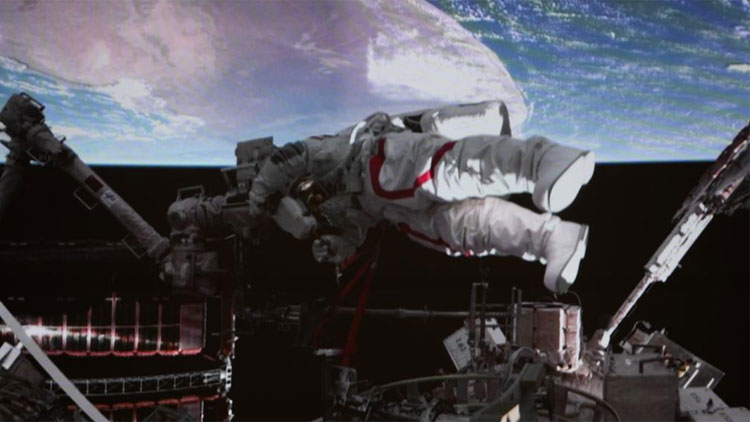 这是12月9日在北京航天飞行控制中心屏幕上拍摄的神舟二十一号乘组航天员武飞在舱外工作的画面。据中国载人航天工程办公室介绍,12月9日18时45分,经过约8小时的出舱活动,神舟二十一号乘组航天员张陆、武飞、张洪章密切协同,圆满完成第一次出舱活动,完成了神舟二十号飞船返回舱舷窗巡检拍照等任务。