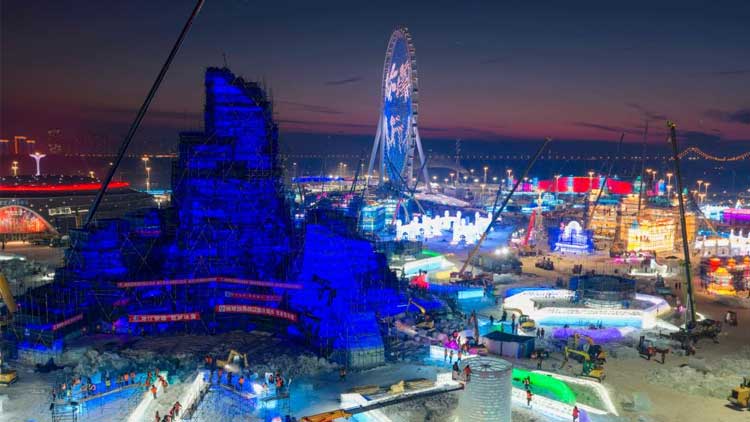 这是12月10日拍摄的哈尔滨冰雪大世界主塔施工现场(无人机照片)。12月10日,第二十七届哈尔滨冰雪大世界主塔“冰灯启梦”封顶,进入最后细节打磨和灯光调试阶段,即将惊艳亮相。