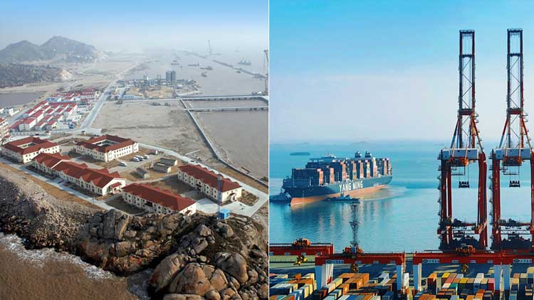 拼版照片:上图为2005年1月16日拍摄的上海洋山港一二期工程;下图为2024年4月10日无人机拍摄的上海洋山港。如今,洋山港已不仅是货物吞吐的枢纽,更是世界航运版图中一个耀眼的坐标。