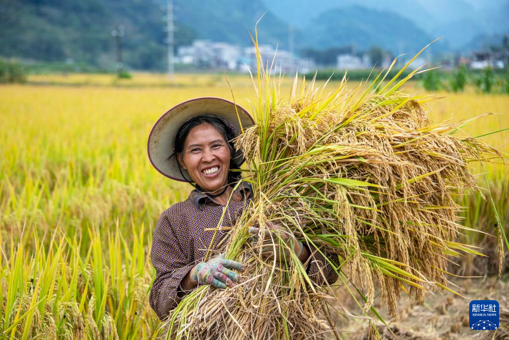 10月30日,广西靖西市禄峒镇大院村农民在收割晚稻。