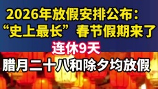 11月4日,国务院办公厅关于2026年部分节假日安排的通知发布。根据通知,春节将在2月15日至23日放假调休,共9天。有媒体注意到,2026年假期总天数较往年并没有增减,但由于在春节前后共调休两个星期六,即2月14日和2月28日,因此拼出一个连续9天的“史上最长”春节连休。其中,农历腊月二十八和除夕两天均放假,腊月二十九即为除夕。