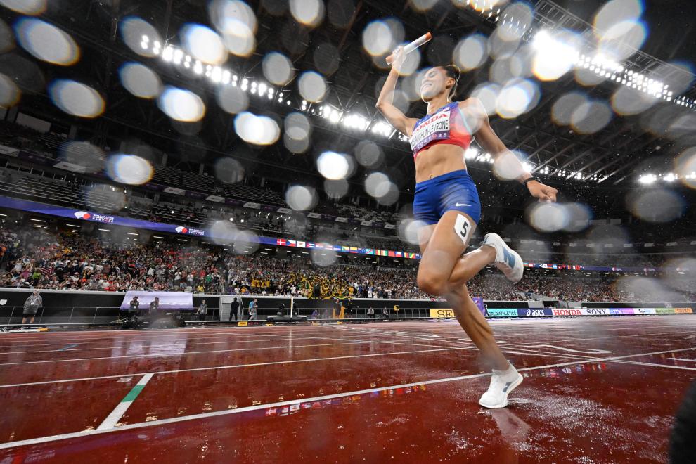 9月21日,2025年世界田径锦标赛女子4x400米接力决赛在日本东京举行,图为美国队第四棒选手麦克劳林在赛后庆祝夺冠。新华社发(吕小炜摄)