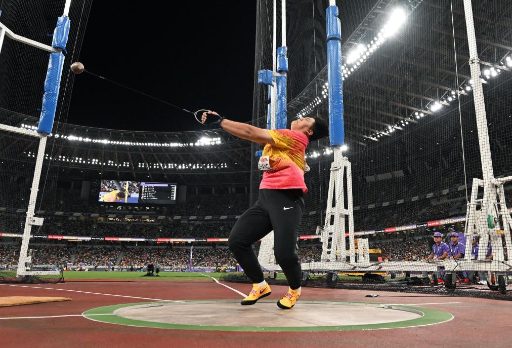 9月15日,2025年世界田径锦标赛女子链球决赛在日本东京举行,图为中国选手张家乐在比赛中试投。新华社记者 宋彦桦摄