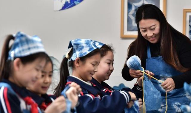 12月15日,河北省安国市实验小学蓝染活动室,老师指导学生利用中药植物染布技术制作手工艾草锤。近年来,安国市依托“千年药都”文化底蕴,创新推动中医药文化深度融入校园教育。截至目前,该市64所中小学、幼儿园开设了与中医药文化相关的特色活动,让孩子们在学习与实践中感受中医药文化的独特魅力。中新社记者翟羽佳 摄