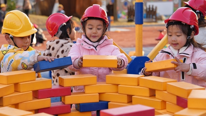 12月15日,江苏省海安市李堡镇新区幼儿园开展户外建构游戏活动,孩子们用积塑搭建创意建筑。活动提升了孩子们的动手能力、合作能力、体能,同时激发了他们的想象力和创造力。(中国教育报-中国教育新闻网通讯员周强 摄)