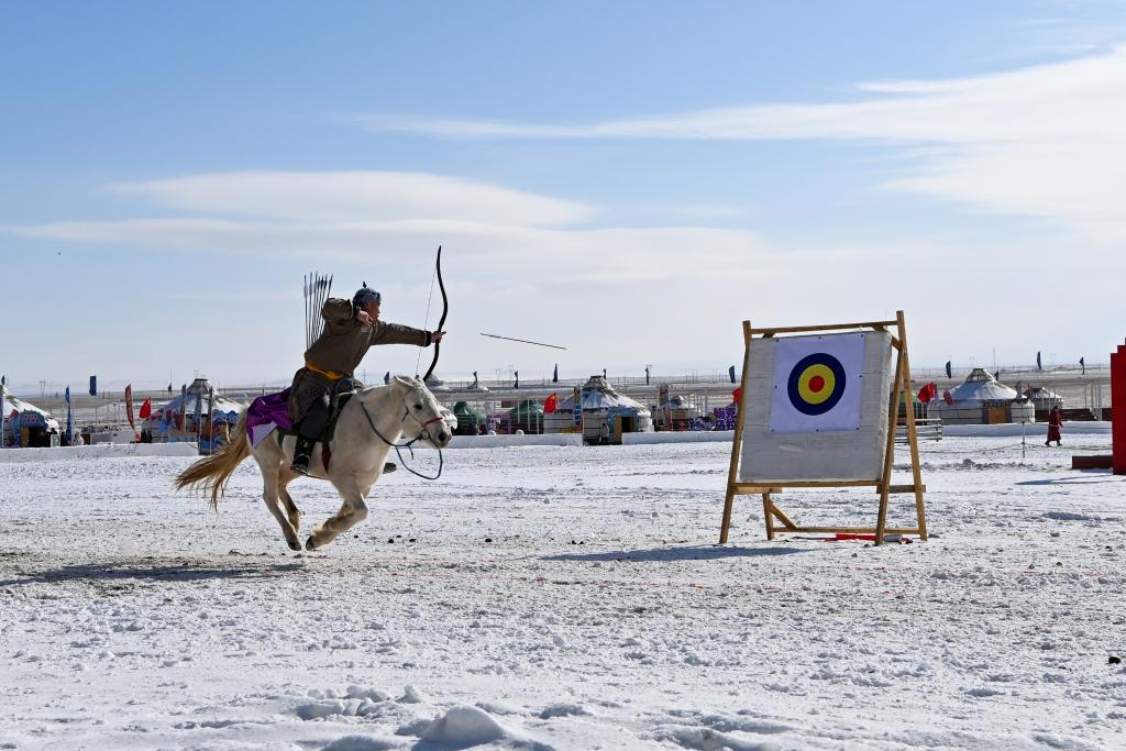 2月1日上午,草原上的气温低至零下十几摄氏度,寒意十足。位于锡林郭勒盟锡林浩特市的锡林郭勒那达慕风情园里却人声鼎沸、热闹非凡,一场精彩的赛马盛会在此举行。跑马射箭比赛现场,一名参赛选手跨马飞奔途中,取箭、拉弓、射击一气呵成,箭矢“嗖”的一声击中靶心,引来观众的阵阵掌声。