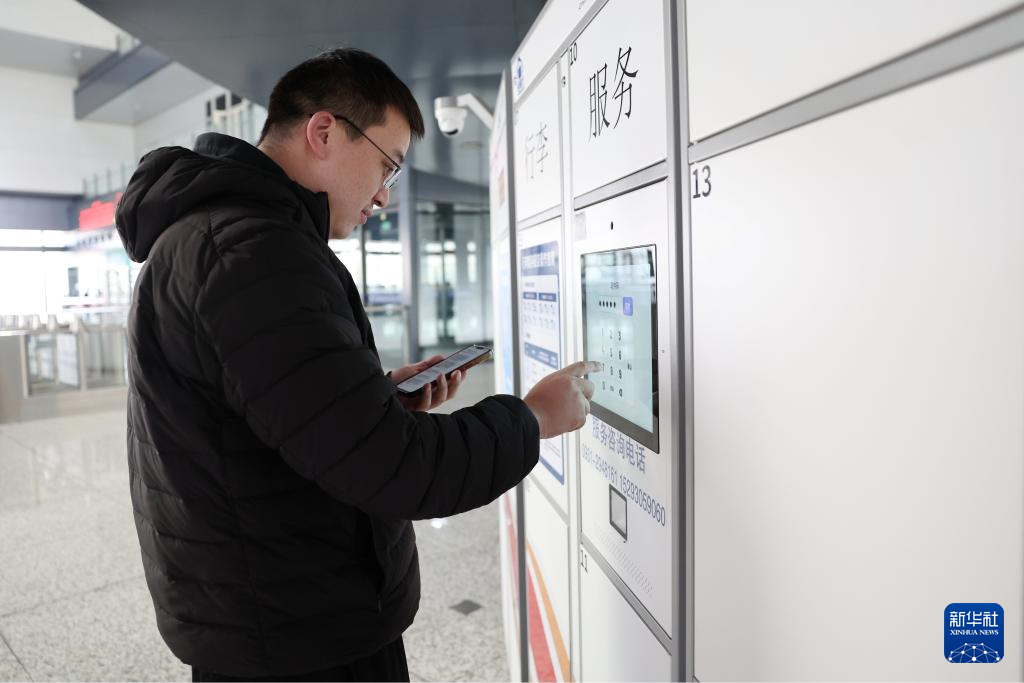 2月8日,中铁快运兰州西站营业部工作人员雒鹏将接收的旅客行李放入候车厅的“轻装行”自助服务柜里。