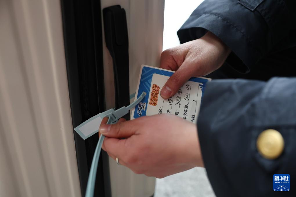 2月8日,中铁快运兰州西站营业部工作人员雒鹏将“轻装行”服务卡挂在旅客的行李上。
