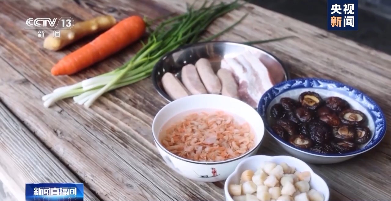 一边蒸饭,一边就可以准备配菜了,五花肉、香菇、干贝、胡萝卜……这些色彩鲜艳的山珍海味都是芥菜饭的“灵魂”搭配。