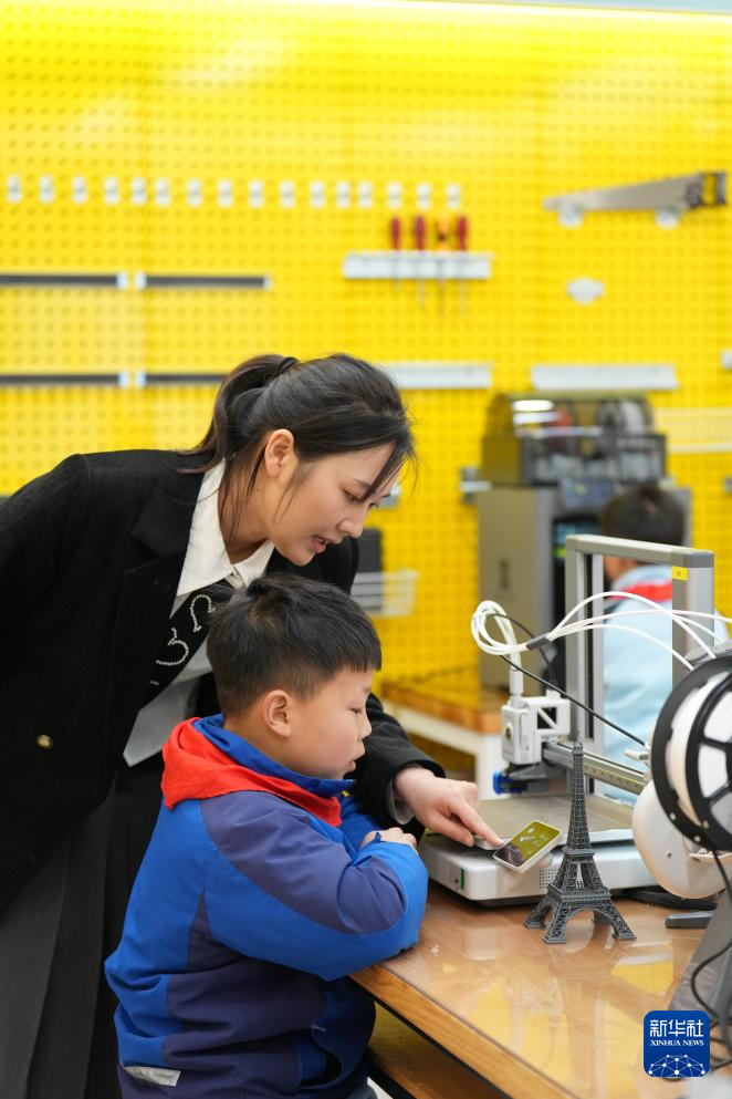 3月17日,老师在湖南湘江新区雷锋小学的3D打印课上辅导学生完成作业。